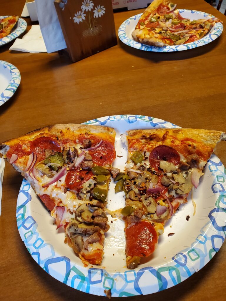 Uncle Larry and I went to Mommom’s house for her birthday. Family came too—Julia and Aunt Dawn. Uncle Larry picked up pizza from Trattoria di Napoli. It was a special with two pizzas, and they were huge. I ate 6 slices!