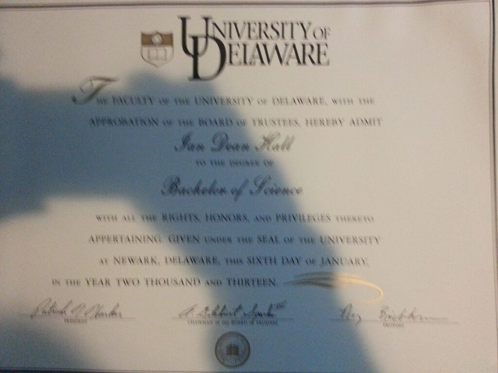 This is my University of Delaware Bachelor of Science degree, awarded on January 6, 2013.