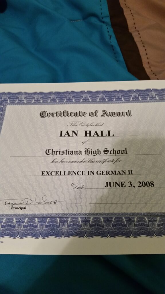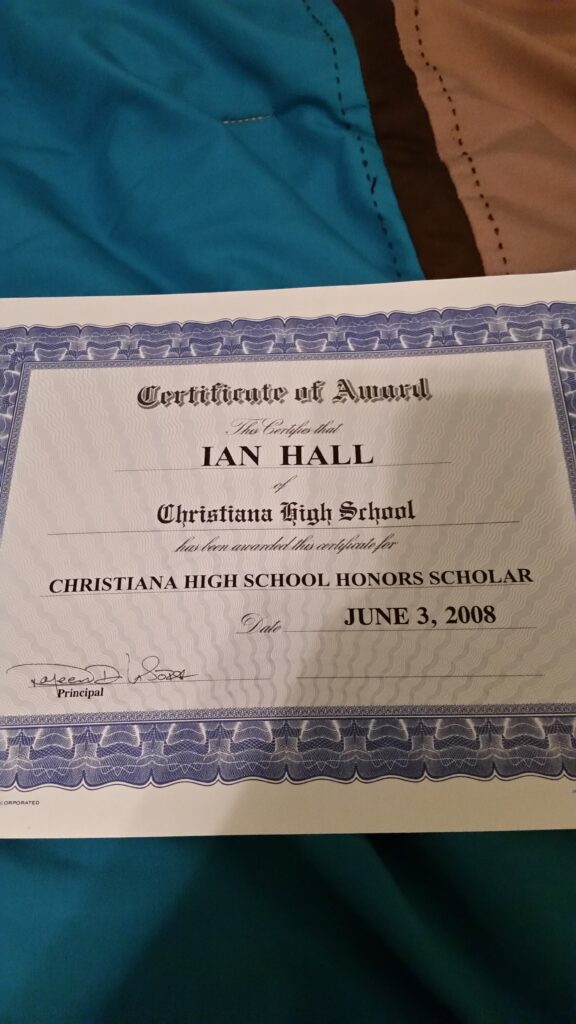 This is my Certificate of Award from Christiana High School, Honors Scholar, awarded on June 3, 2008.