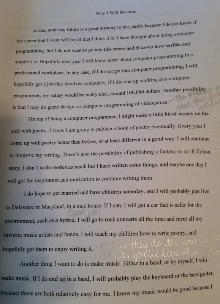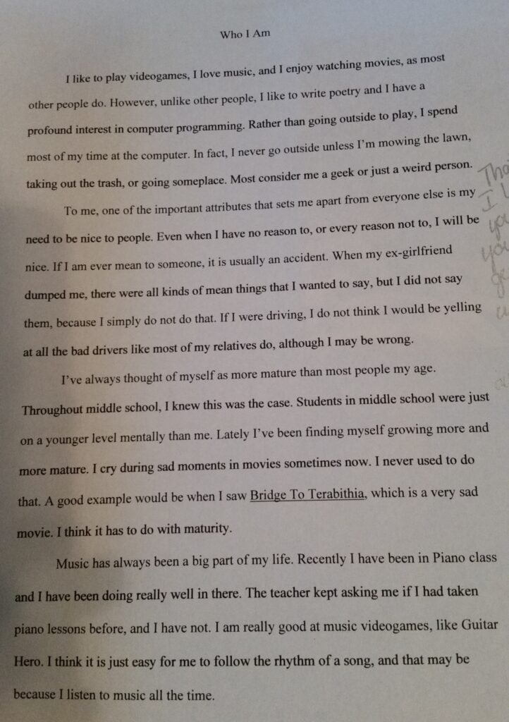 What I like to do most is play videogames and listen to music at the same time. As soon as I get home from school, I work on my homework as fast as I can so I can play. Usually, when I am at my house, I ride my bike around the neighborhood a few times. My favorite music is rock’n’roll. Sometimes, I go to my friend’s house and play in the woods behind his house. Some people think it is weird that I like school. My favorite subject is math. My favorite color is blue. My favorite teacher is Mr. Brustcker, from 4th grade. Mrs. Chapman is just as nice as Mr. B. Mr. B is his nickname.