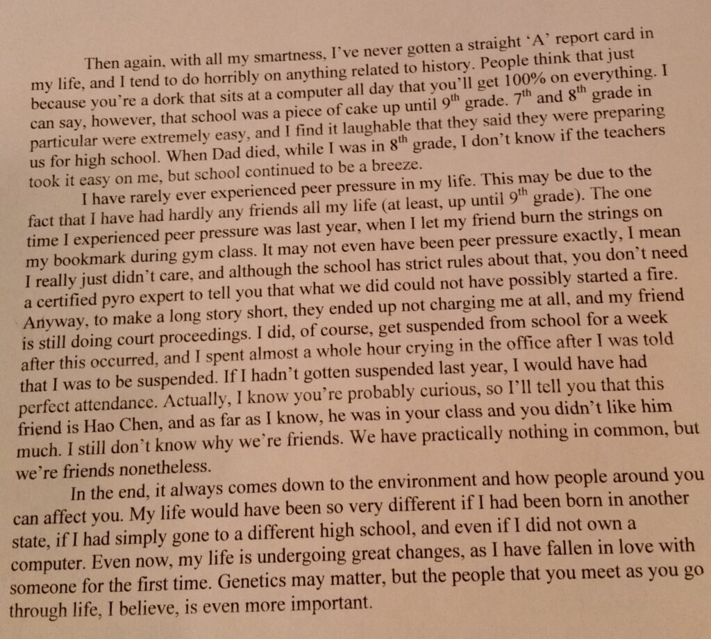 On the first day of school this year, I was very excited. I thought fifth grade was hard at first, but it is easy so far. I never knew we’d get so much homework, althought the homework is easy.